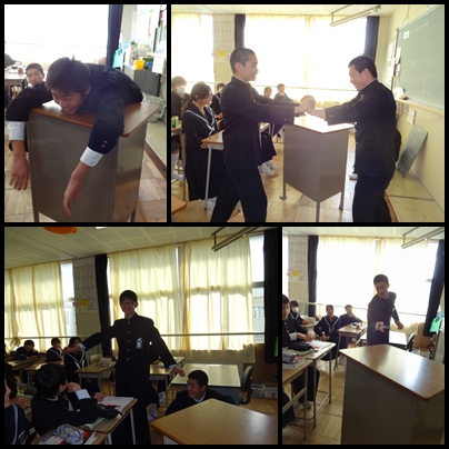教卓を日本列島に見立てて,何人かの生徒に小笠原気団・揚子江気団・オホーツク海気団・シベリア気団・台風の役をやってもらい,日本の四季に気団の与える影響について話をしました。
