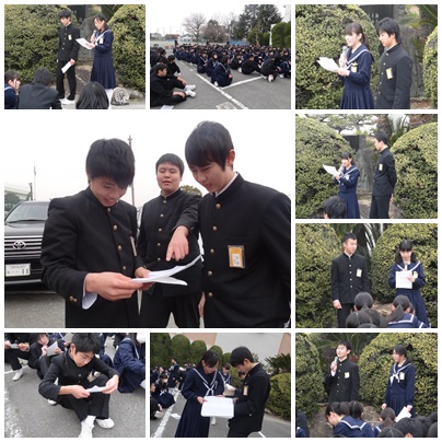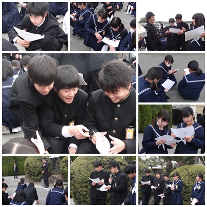 3年生の5時間目は巣立ちの式でした。1年生の4月,15歳の自分に向けて書いた作文を願いの像から取り出しました。今より上手にかけなかった字,拙い文章を見て「恥ずかしい!」という声がたくさんありましたが,3年間の成長も実感できたようです。「1年生のころと考えていたことが変わった」と感じた生徒が多くいました。