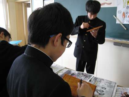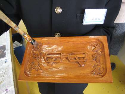 これまでの授業でレリーフの彫刻を終え,ニスで仕上げる作業を丁寧に行ってきました。塗りあがった作品はピカピカと光って,すてきな仕上がりでしたね。
