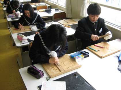 すでにペン皿の制作が終わっている人は,ペーパーナイフの削りだしに取り組んでいました。多くの黙々と作業している生徒の姿を見ることができました。