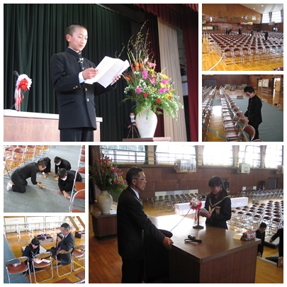 明日はいよいよ卒業式です。今日は1年生は5時間で下校となりましたが,その後,明日の式場となる体育館で活動する生徒たちがいたことを,ぜひ知っておいて下さい。