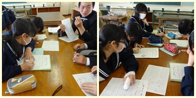 修学旅行に向けて 公開日 2015/03/23 更新日 2015/03/23 2年生 今日の学活の時間では,修学旅行班別研修の計画表を旅行会社の方にチャックしてもらったものが返ってきたので,それの訂正を行いました。修学旅行まで,あと一ヶ月半です。 いいね(0)