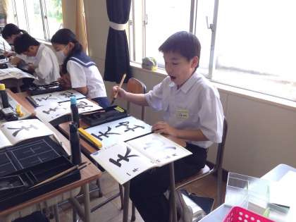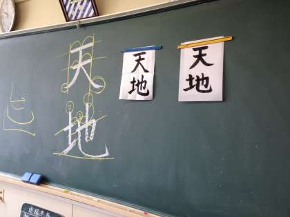 1年生の国語の授業では、書写の授業も行っています。今日は「天地」という字を書きました。のびのびとした字を書く人が多かったです。また、服を汚さず書くことができました。