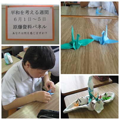 今日の2年生の教室では,平和への願いを込めながら平和派遣の際に広島に奉納する折り鶴をおる姿が多く見られました。折り紙が苦手な生徒が得意な生徒に折り方を聞きながら楽しげに折り鶴をつくっている様子は,まさに平和な光景でした。