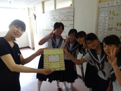 明日からお休みに入られる田中先生に,1番お世話になった3年生の中で,旧2年4組の生徒達が田中先生へのメッセージ込めた寄せ書きを渡しました。3年生は,1年・2年と担任として英語の先生として,またバレー部の顧問としても大変お世話になりました。今年同じ学年でなかったのは残念でしたが,合唱コンクールなどは見に来てくださる予定だそうです。元気な赤ちゃんを産んで,元気な姿を見せてくれるのを楽しみにしています。