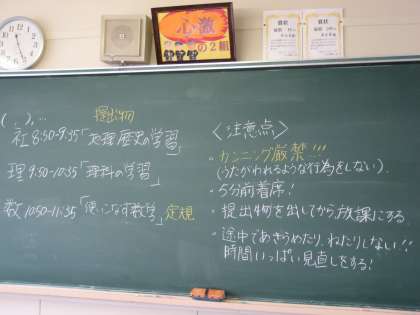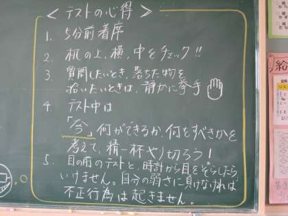 2年生の各教室をのぞいてみると,それぞれの担任の個性ある注意事項に目を引かれました。先生たちの願いは,すべての生徒がルールを守り,これまでに努力してきた成果を十分に発揮し,最後まであきらめることなく全力で取り組むことで,悔いのない結果を受け取れることです。