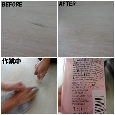 学校の廊下には,黒い線がたくさんあります。これは,バレーシューズと廊下との間での摩擦によりできるものがほとんどです。理科室前の廊下では,写真にあるような液体を使って掃除をしています。すると,きれいに黒い線がとれます。これは,液体に少量入っているアセトン(有機溶剤)が汚れを剥離して取りやすくしているからです。