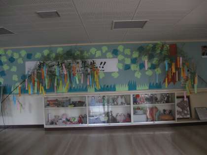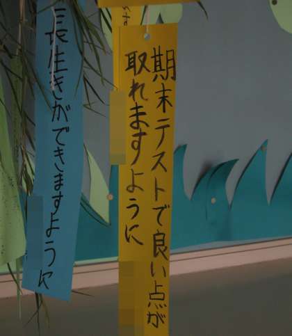 笹の葉をいただけたので、1年生では短冊に願い事を書いて吊しました。