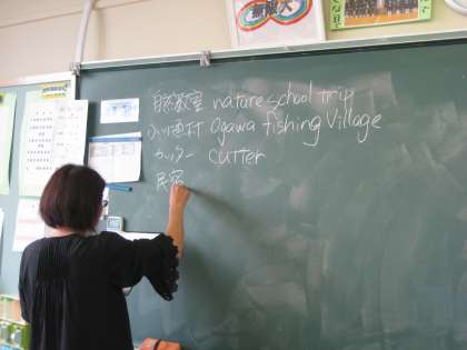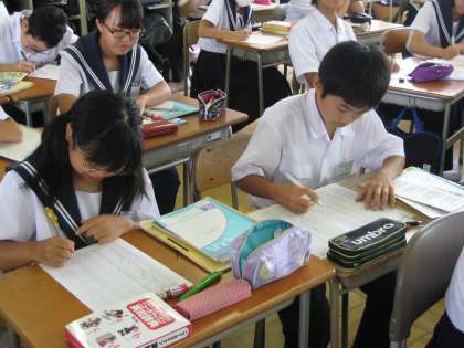 「自然教室」は「Nature School trip」,「漁り火の集い」は「fire festival」などの表現を学び,これまでに学習した知識を活用して必死に作文していました。
