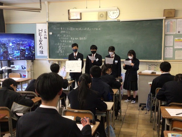 自分たちが学習した国について調べたことや集めた資料をまとめ、発表します。