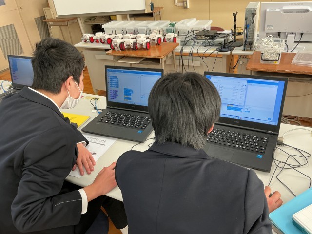 本日の技術の授業では、プログラミングを行いました。とても真剣に取り組み、イルミネーションのようなプログラムを作った生徒もいました。