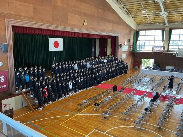 本日の午前中は、合唱の仕上げから始まりました。細かいところまでこだわって確認をし明日に備えます。その後は第3学年修了式、同窓会入会式などが行われました。卒業証書授与の最終練習も行いました。本年度は保護者席に背を向けた方向で証書を受け取った後に、回れ右をして晴れやな表情を保護者の皆様に見ていただきながら降壇していきます。