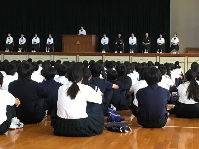 朝の時間に広島派遣報告会を行いました。